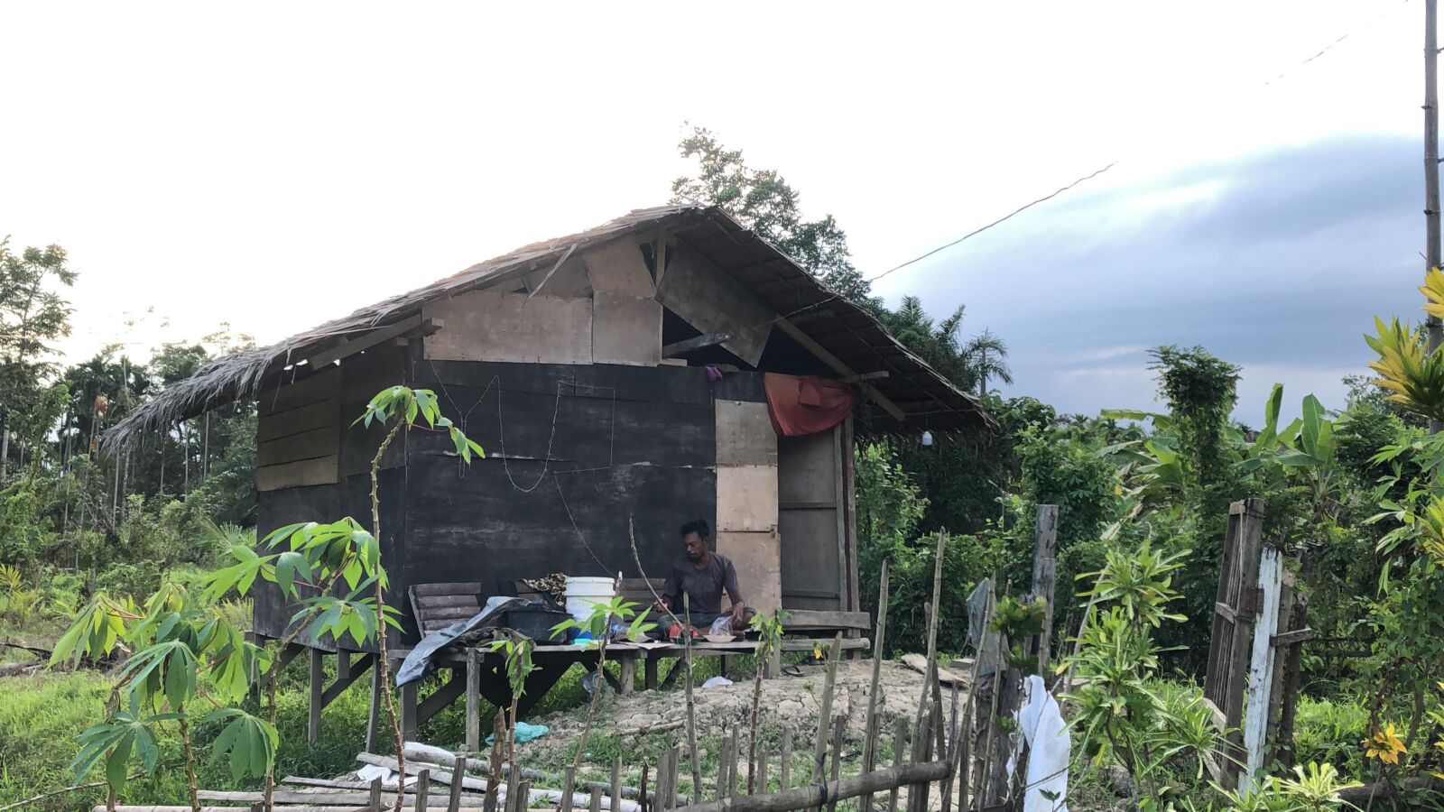 Berdinding triplex dan papan kayu yang sudah lapuk, sebagian dinding terlihat terlepas dan berlubang, sementara atap rumbia tampak rapuh dan nyaris ambruk. Bangunan tersebut berdiri di atas tiang kayu sederhana, dengan tanah di bawahnya yang retak dan tidak rata. Kondisi ini terlihat pada Minggu (18/01/2026).