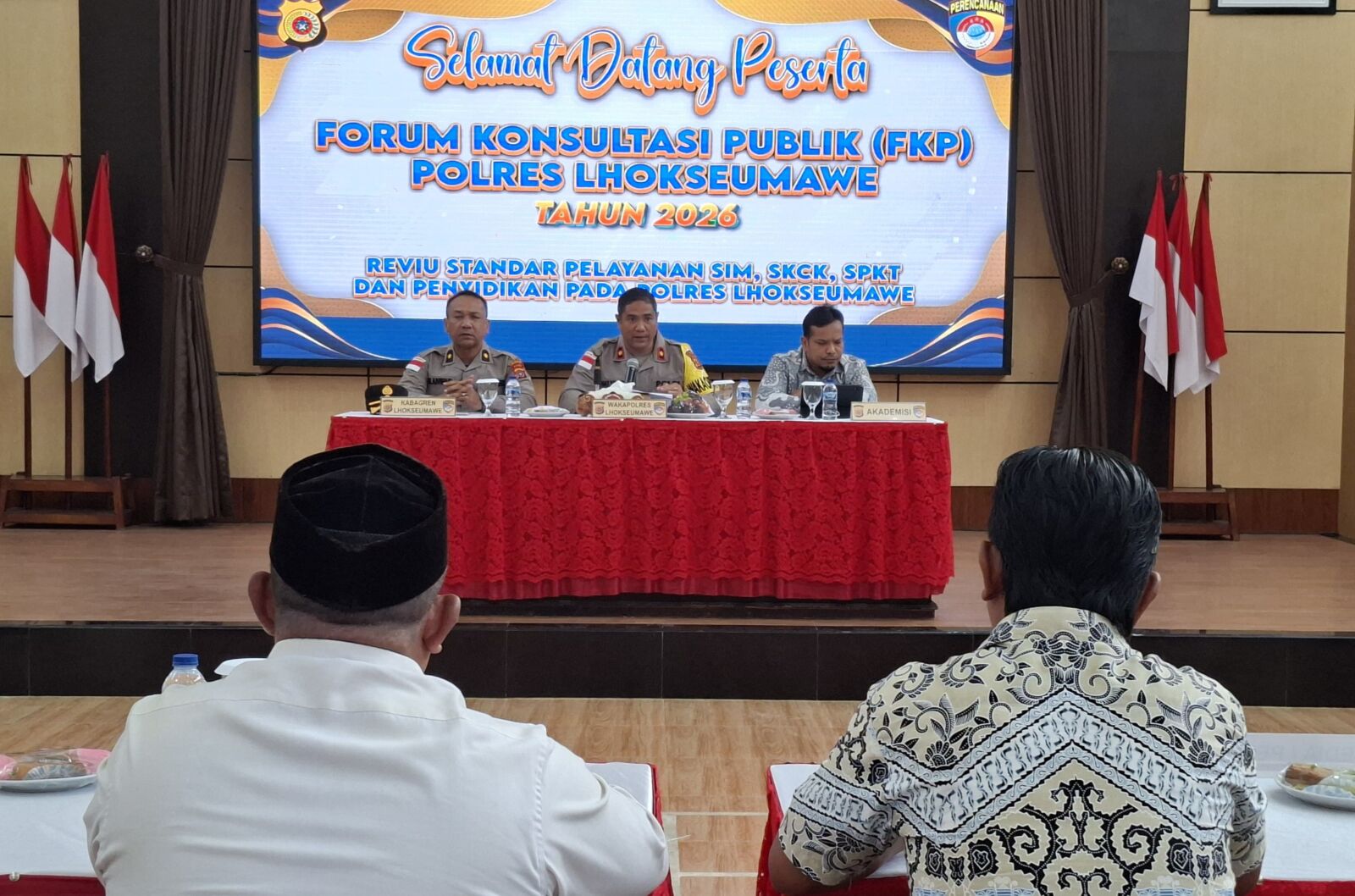 LHOKSEUMAWE – ForumKeadilanAceh.com | Dalam rangka meningkatkan kualitas pelayanan publik di wilayah hukumnya, Polres Lhokseumawe menggelar Forum Konsultasi Publik (FKP) Tahun 2026 yang berlangsung di Gedung Serbaguna Wira Satya Mapolres Lhokseumawe, Jum’at (13/2/2026) pagi.
