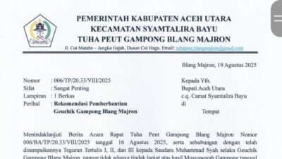 Aceh Utara – ForumKeadilanAceh.com | Tuha Peut Gampong Blang Majron resmi mengeluarkan surat rekomendasi pemberhentian…